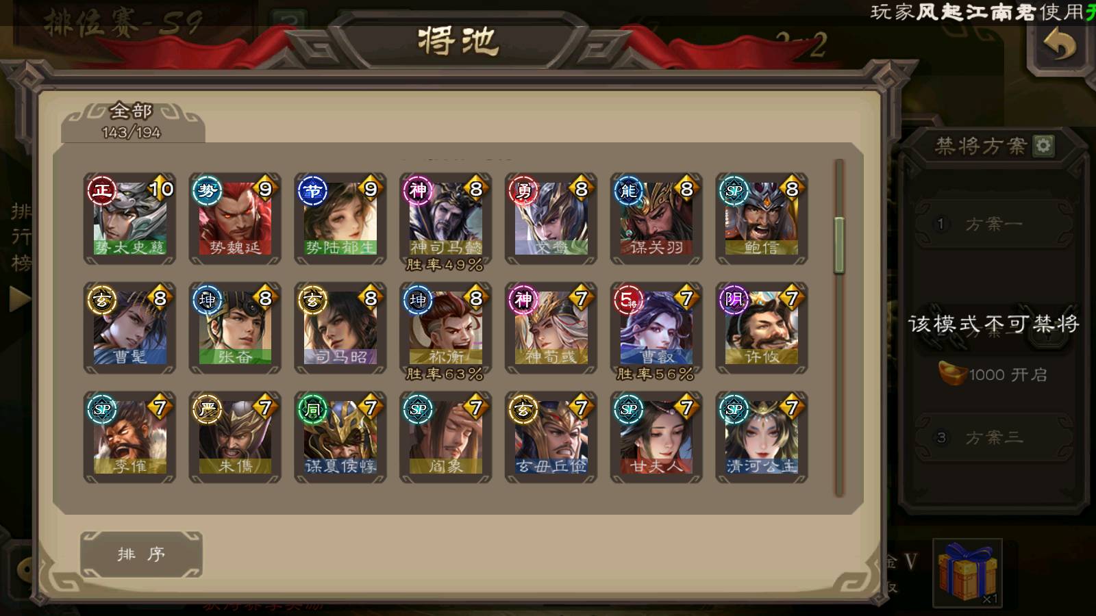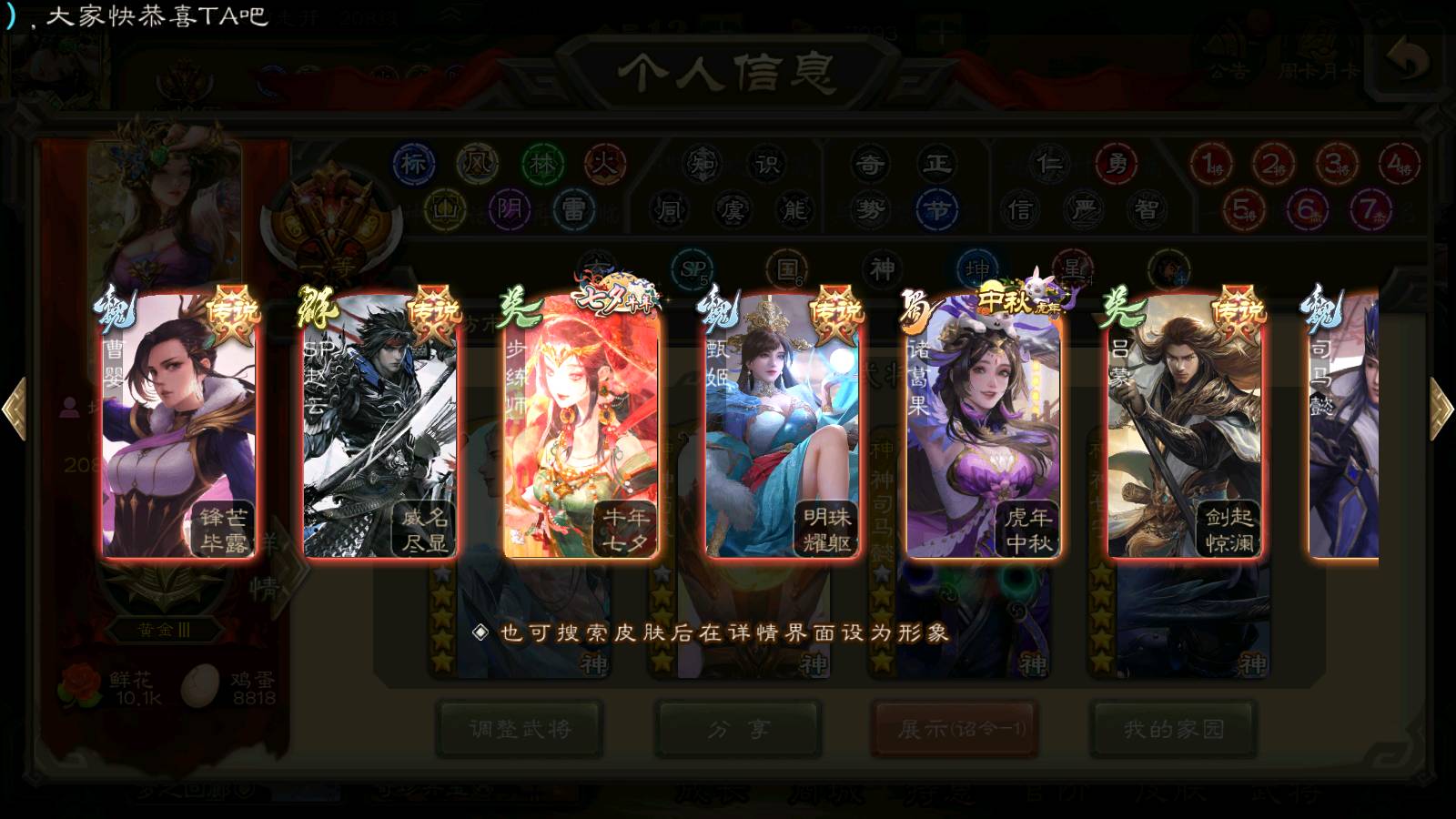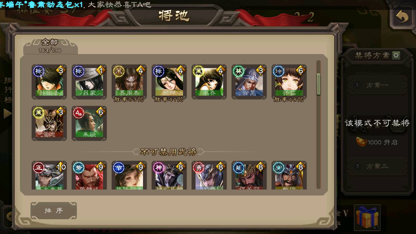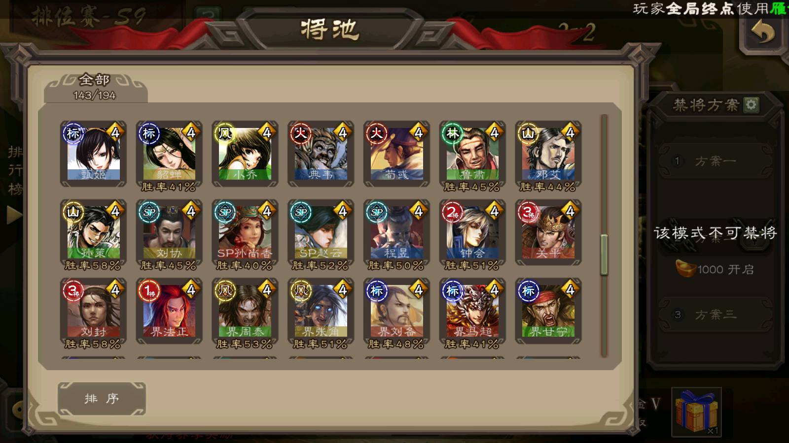 (群雄):刘焉,祢衡,界左慈,界沮授,南华老仙,麴义,许攸,张仲景,司马昭,张让,界李儒,苏飞,星董卓,张琪瑛,谋张角,公孙康,审配,星黄忠,左慈,沮授,兀突骨