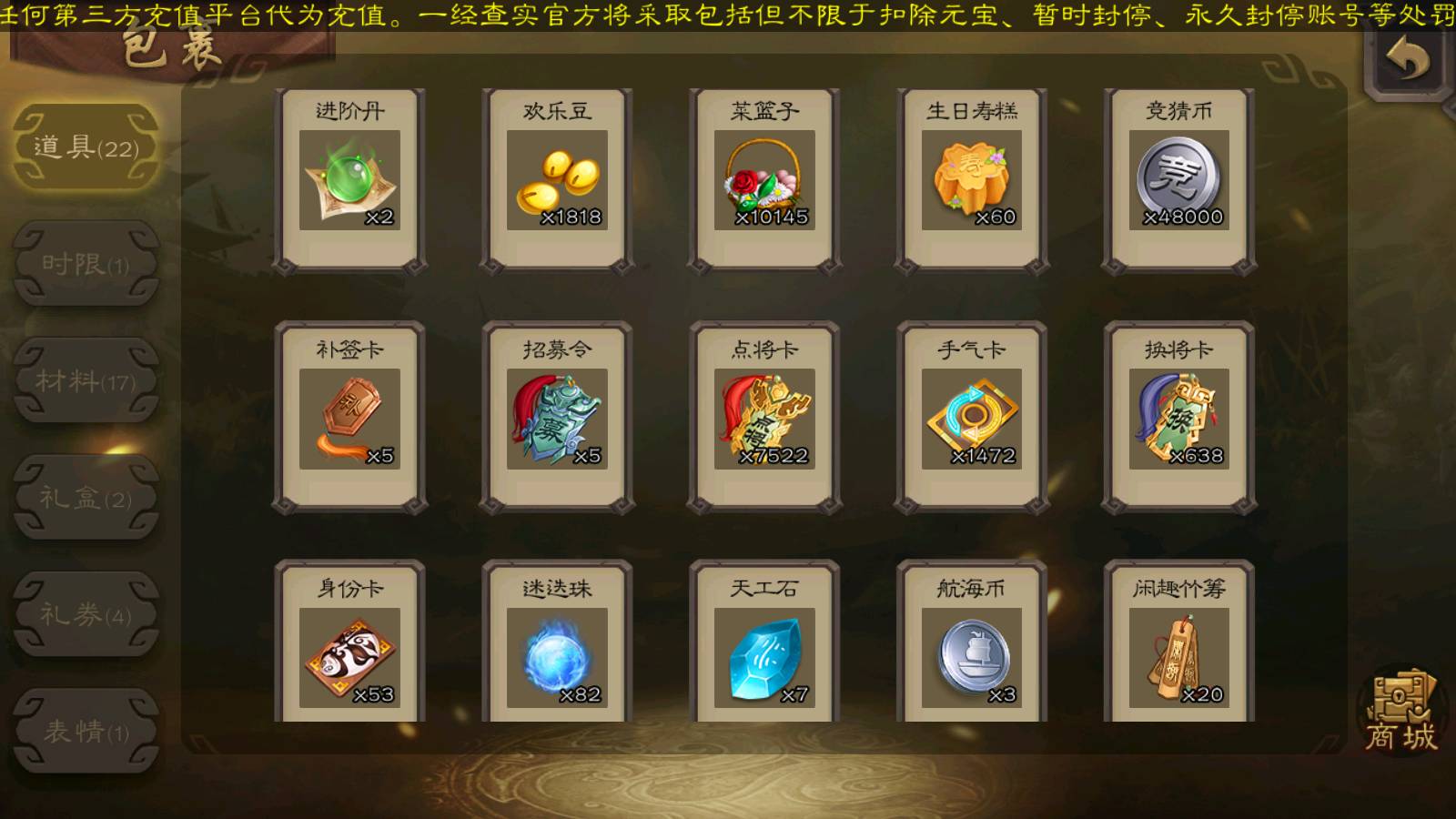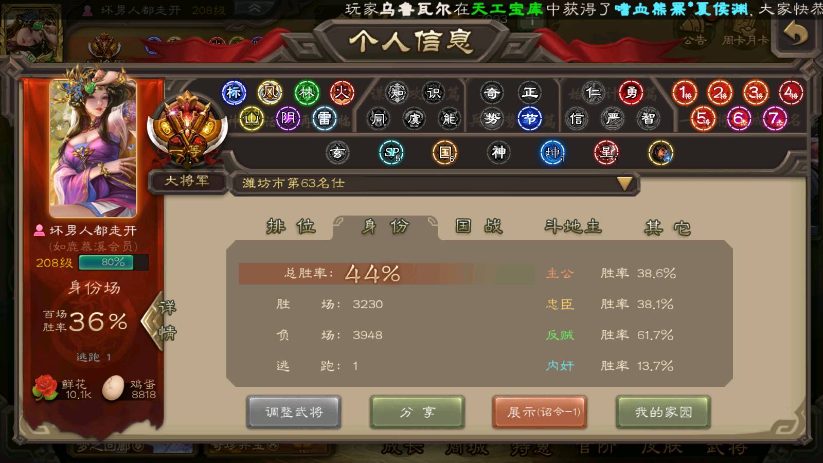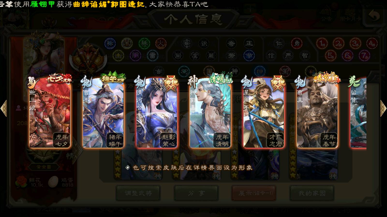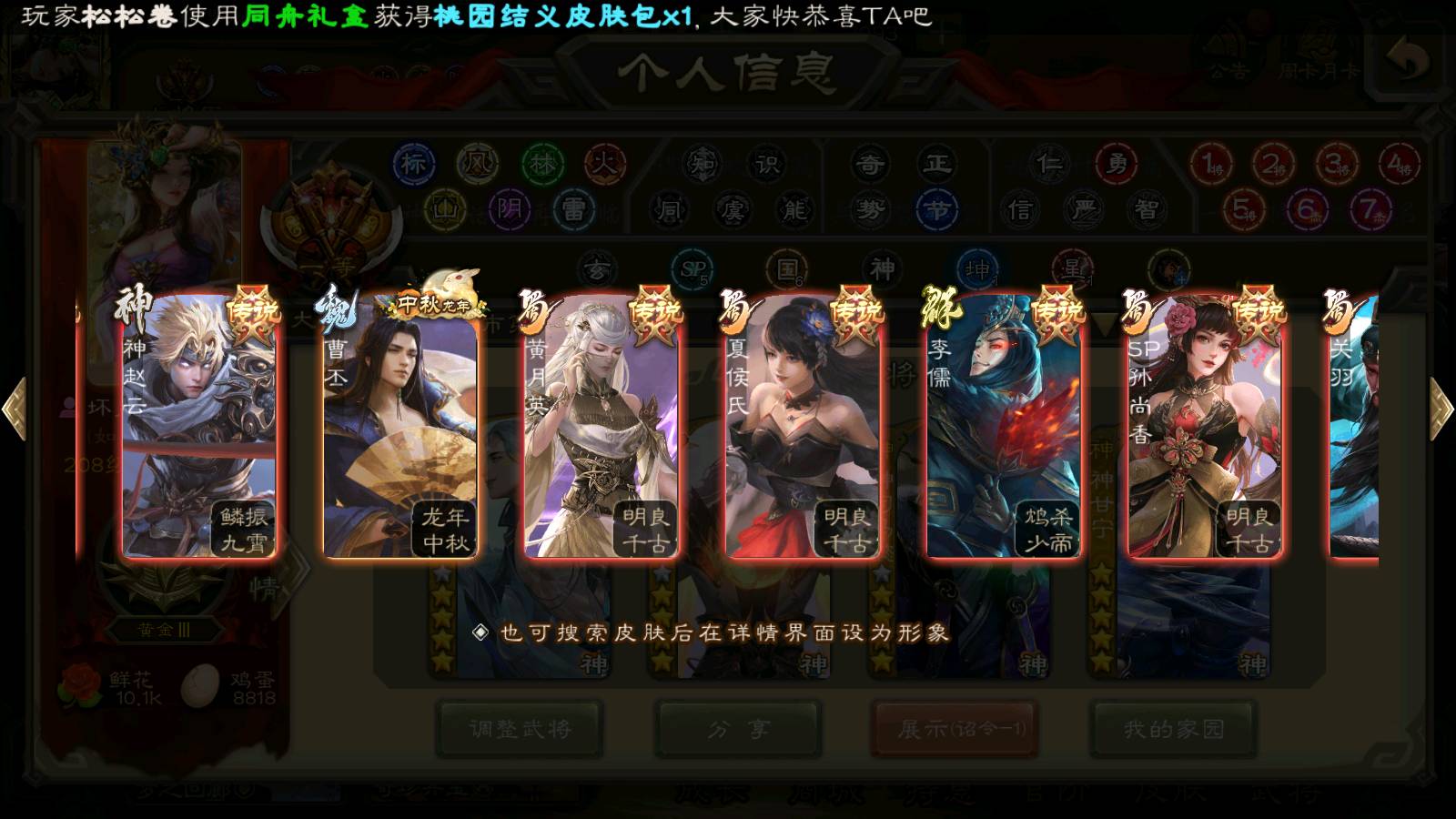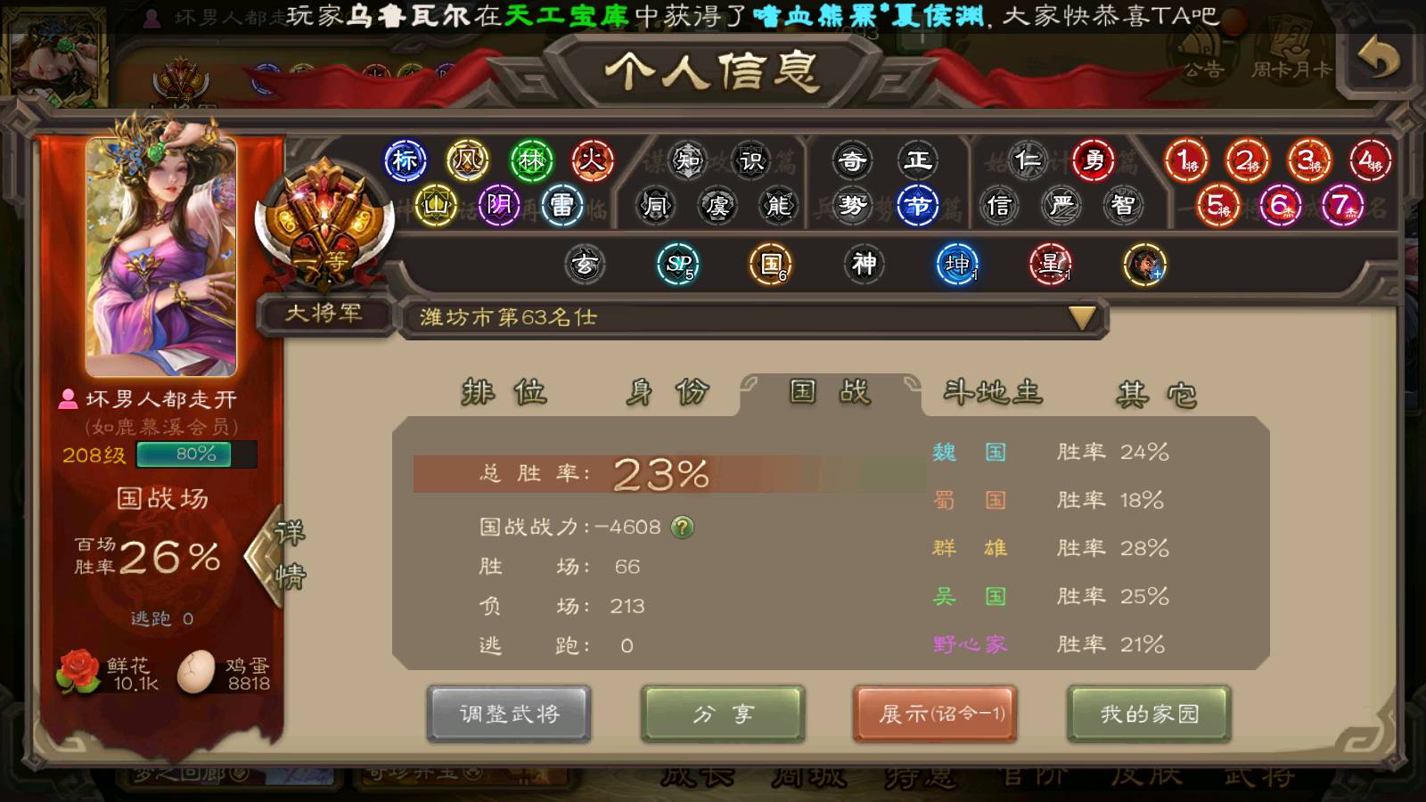 (群雄):刘焉,祢衡,界左慈,界沮授,南华老仙,麴义,许攸,张仲景,司马昭,张让,界李儒,苏飞,星董卓,张琪瑛,谋张角,公孙康,审配,星黄忠,左慈,沮授,兀突骨