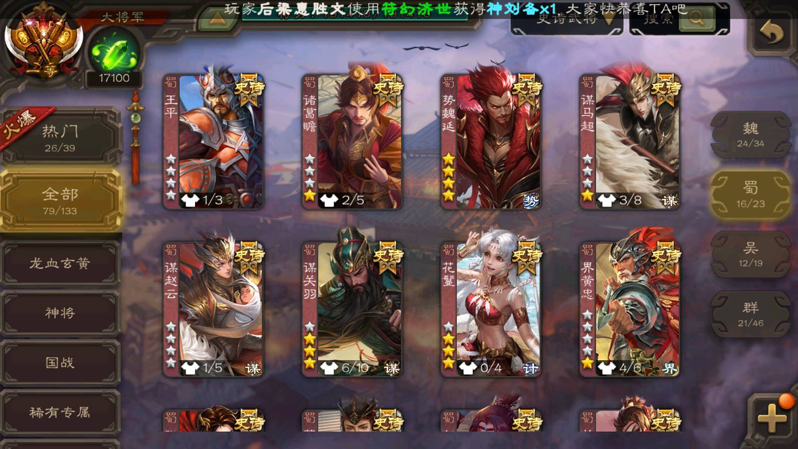 (蜀国):界黄忠,周群,谋关羽,势魏延,诸葛瞻,谋赵云,花鬘,沙摩柯,谯周,傅佥,谋马超,关索,张星彩,王平,董允,赵襄