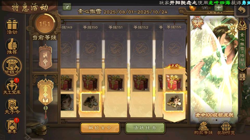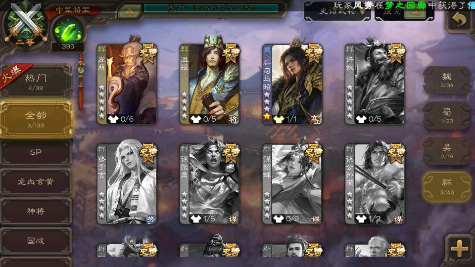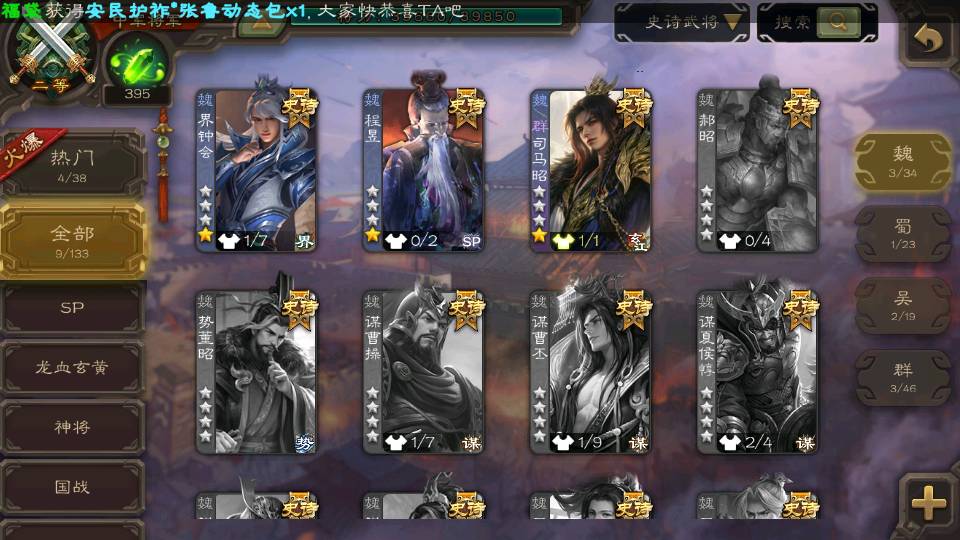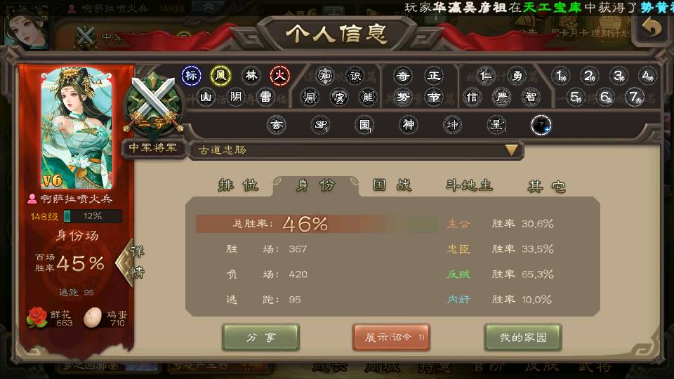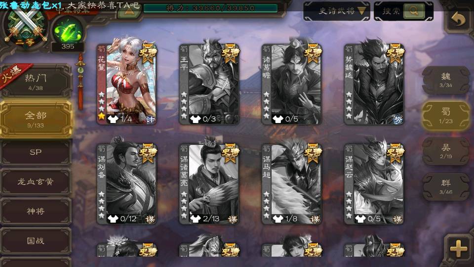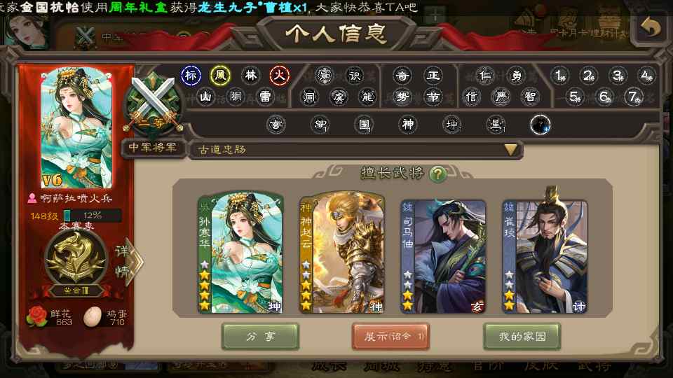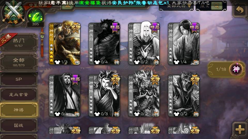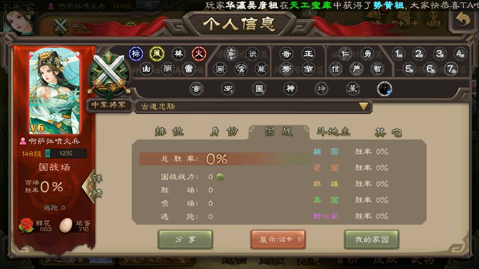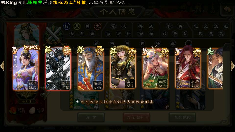 商品编号22700 编号22700 全部皮肤159,动态皮肤9,全部武将181,排位武将62,国战武将55,史诗武将9,vip:6,欢乐豆2.9w