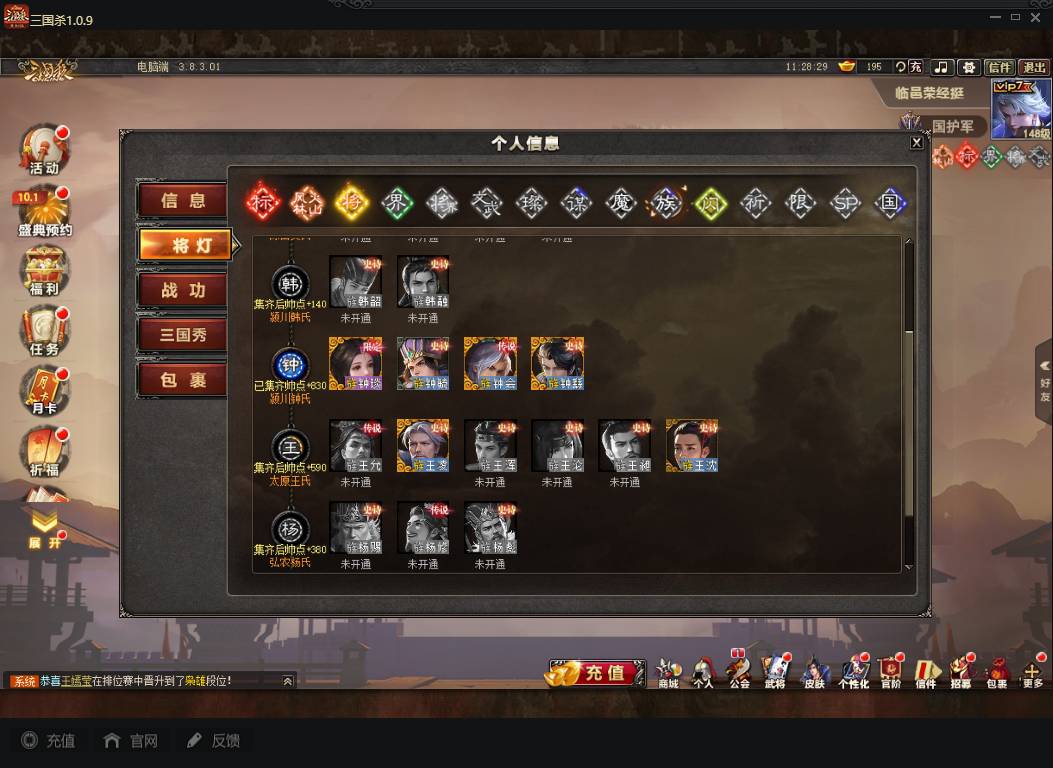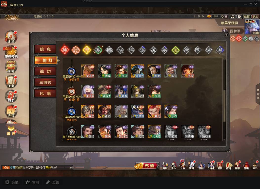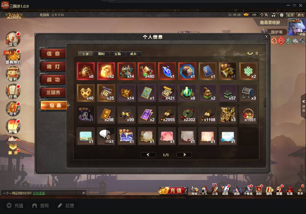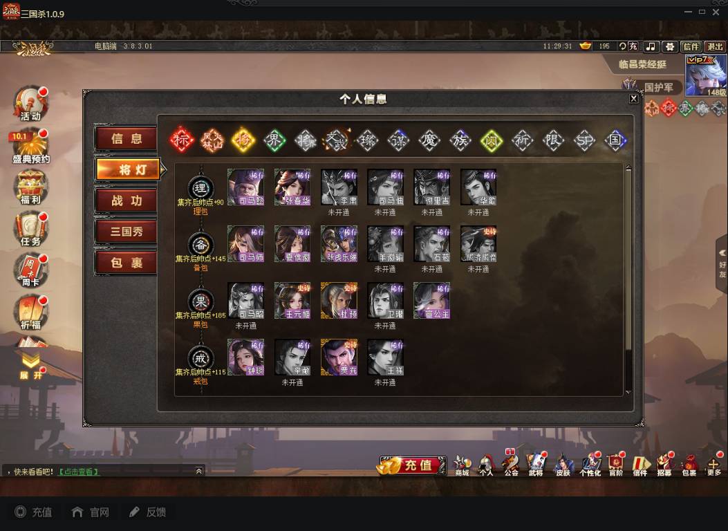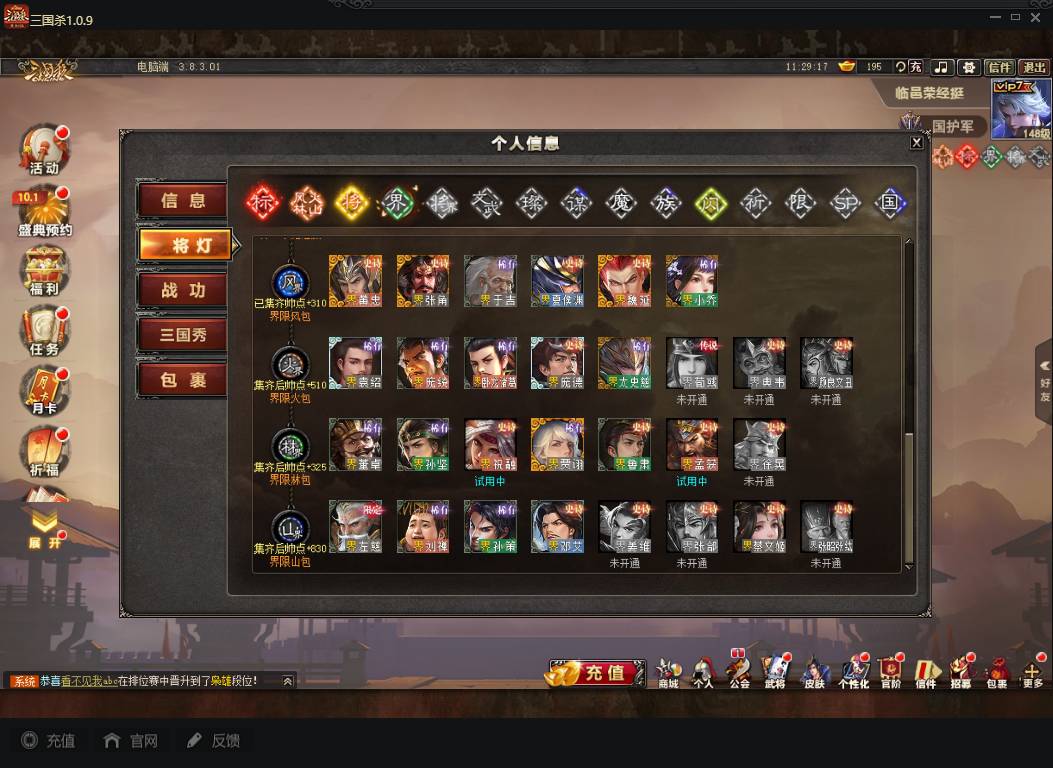 商品编号A072 V7等级+卧龙凤雏(限动),费祎,蒋琬,+张华+族钟琰,族钟会+谋关羽,谋董卓(传动),谋华雄+魔吕布,总武将313,五阶31,皮肤918,动18,花好收藏册达成,包裹:玉玺42,灵宝480,官阶:国护军