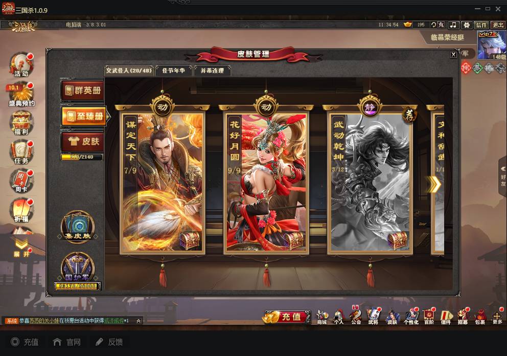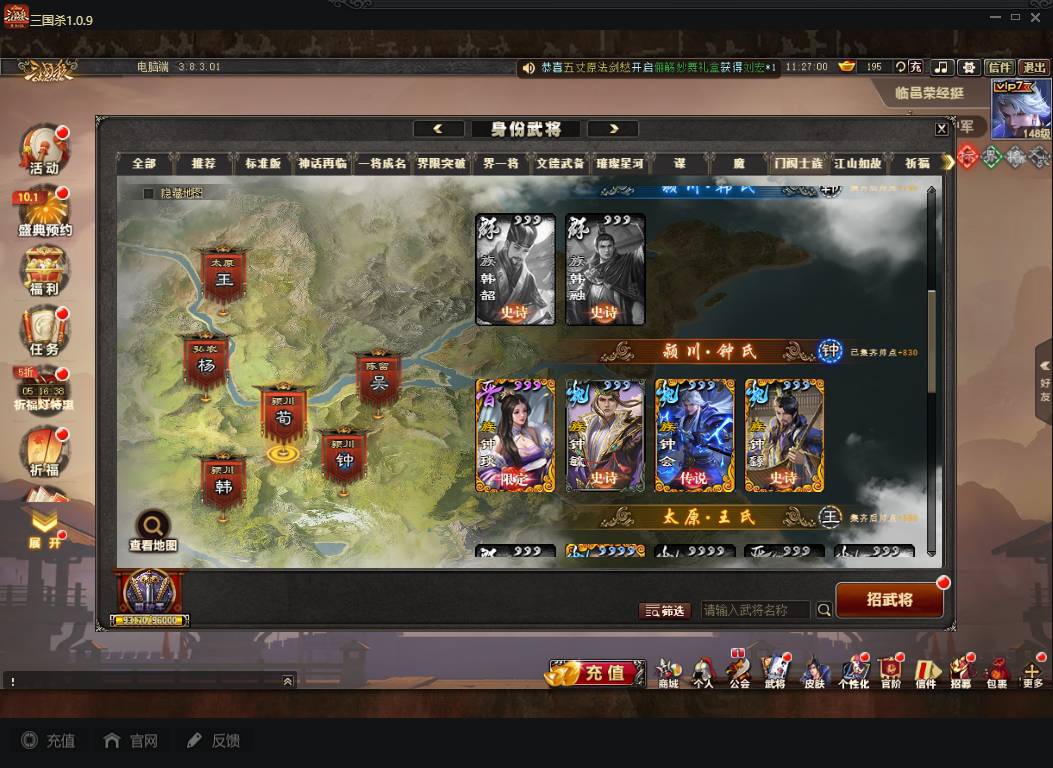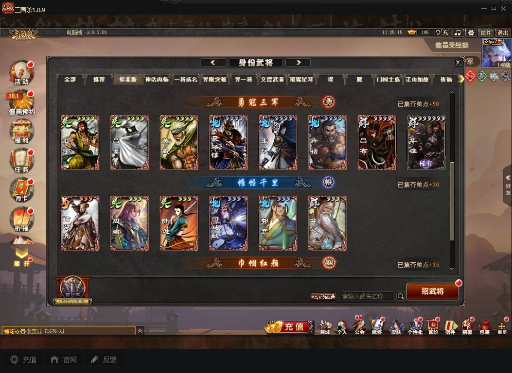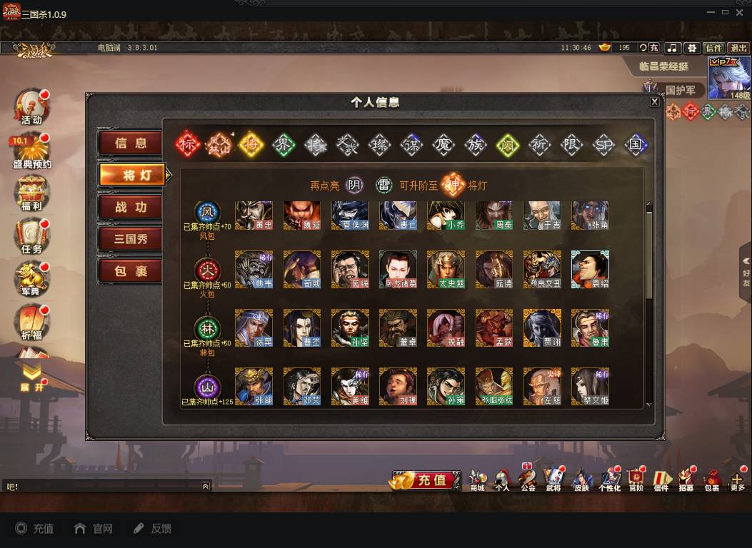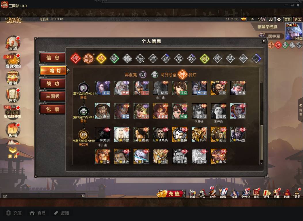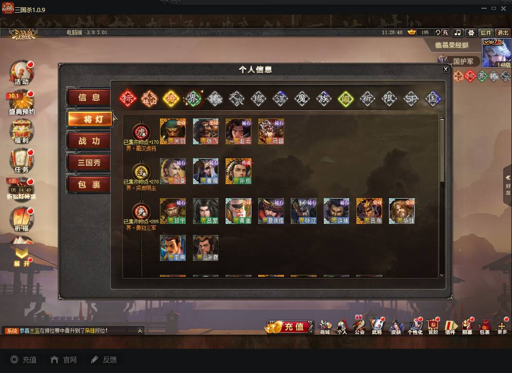 商品编号A072 V7等级+卧龙凤雏(限动),费祎,蒋琬,+张华+族钟琰,族钟会+谋关羽,谋董卓(传动),谋华雄+魔吕布,总武将313,五阶31,皮肤918,动18,花好收藏册达成,包裹:玉玺42,灵宝480,官阶:国护军