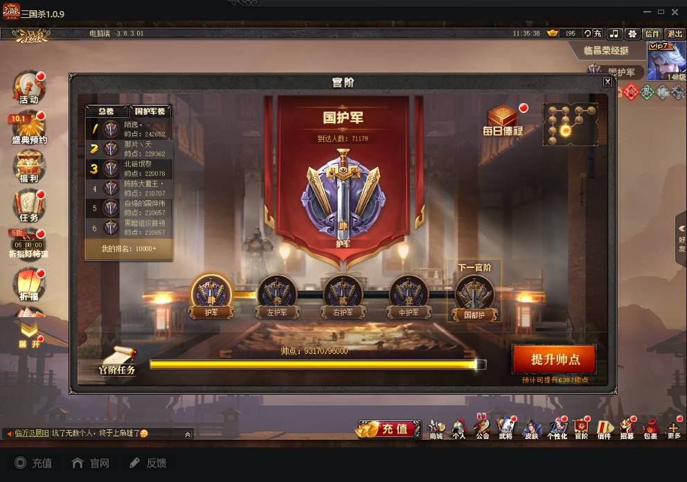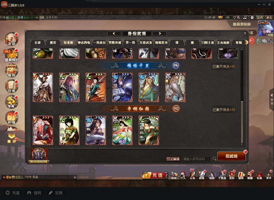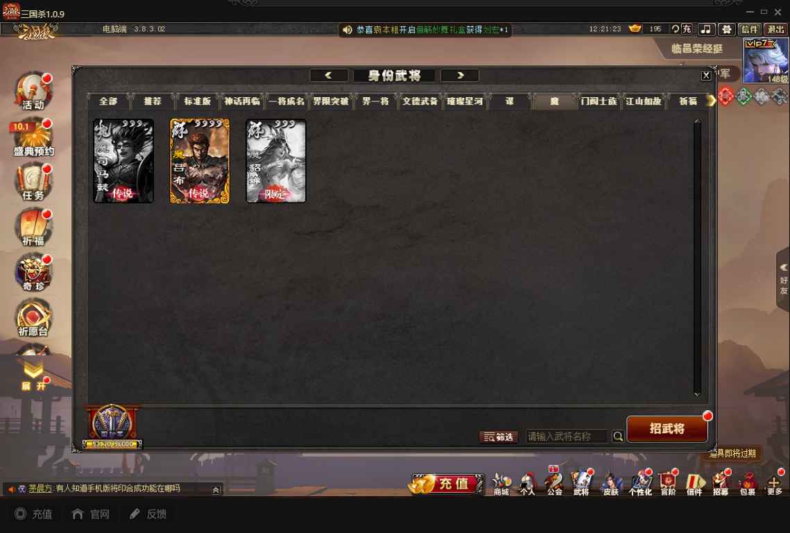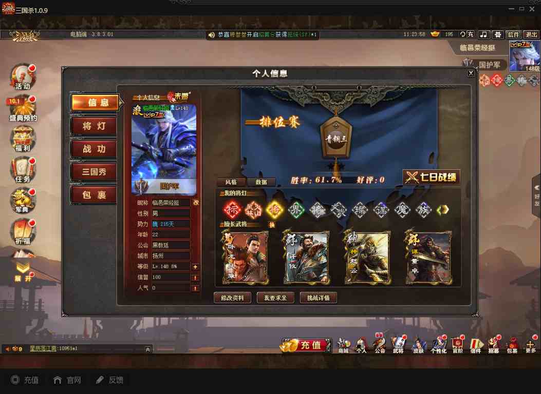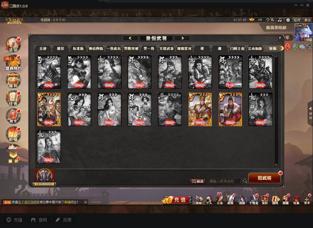 商品编号A072 V7等级+卧龙凤雏(限动),费祎,蒋琬,+张华+族钟琰,族钟会+谋关羽,谋董卓(传动),谋华雄+魔吕布,总武将313,五阶31,皮肤918,动18,花好收藏册达成,包裹:玉玺42,灵宝480,官阶:国护军