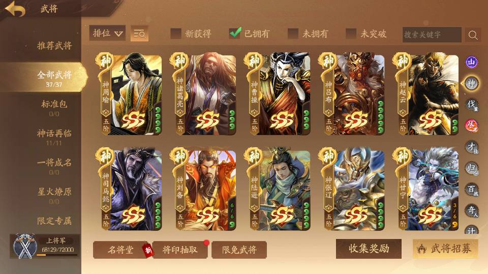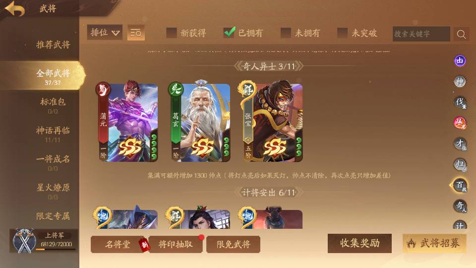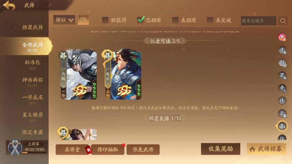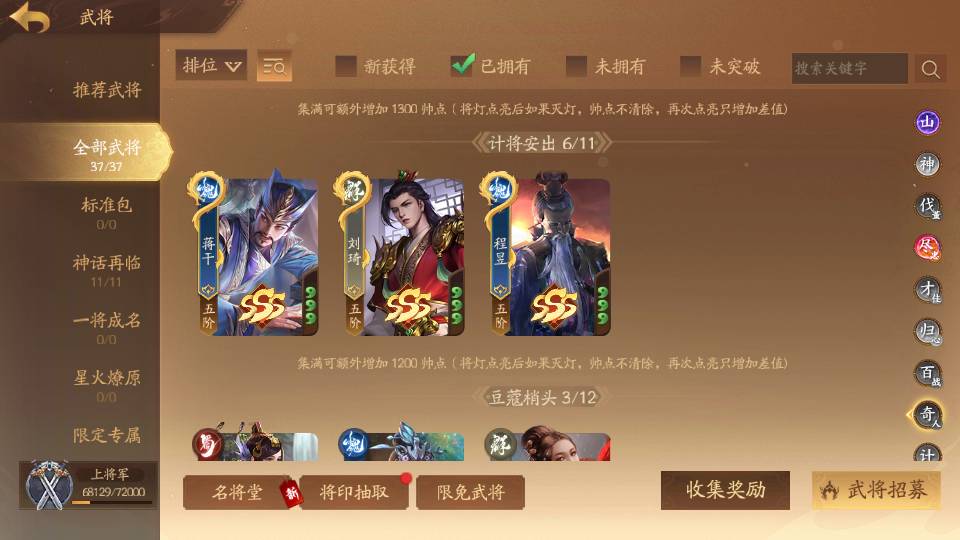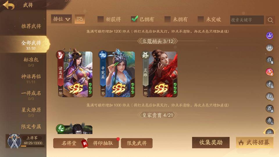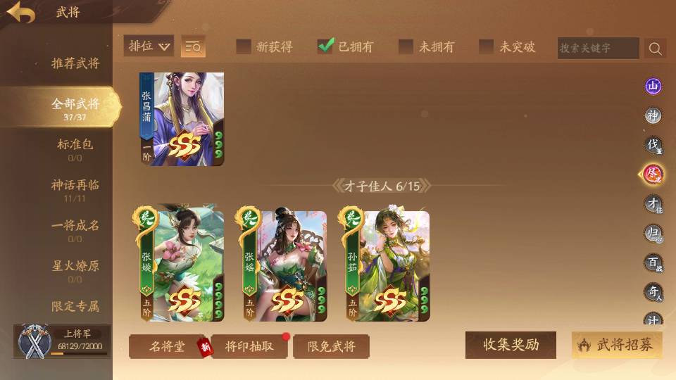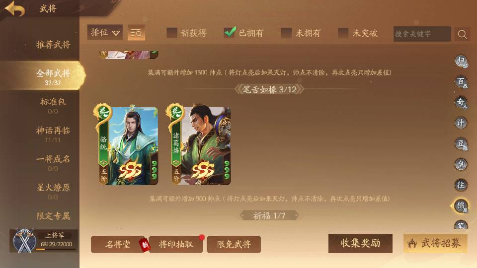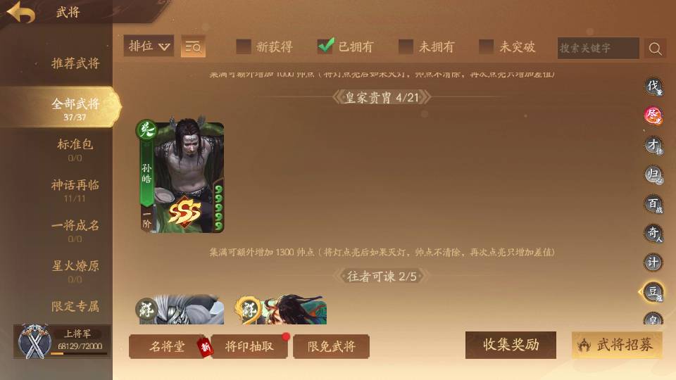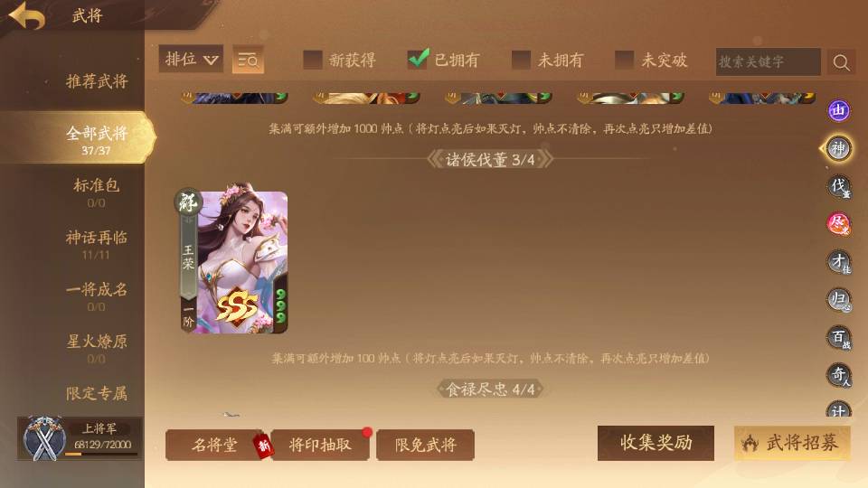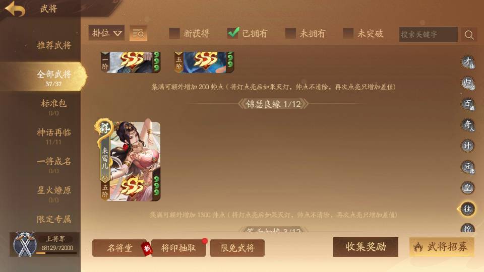 商品编号Dsa175 编号Dsa175 武将:王荣,关索,程昱,来莺儿,蒲元,葛玄,张嫙,骆统 将灵:SSA关索 包裹:祈福灯2,V6会员,总武将277,总皮肤1143,总国战98,帅点6.8w