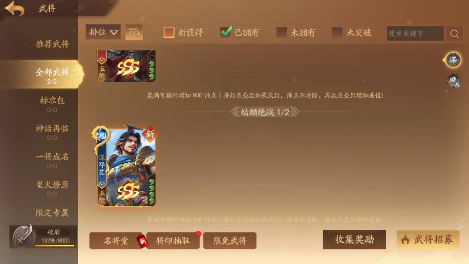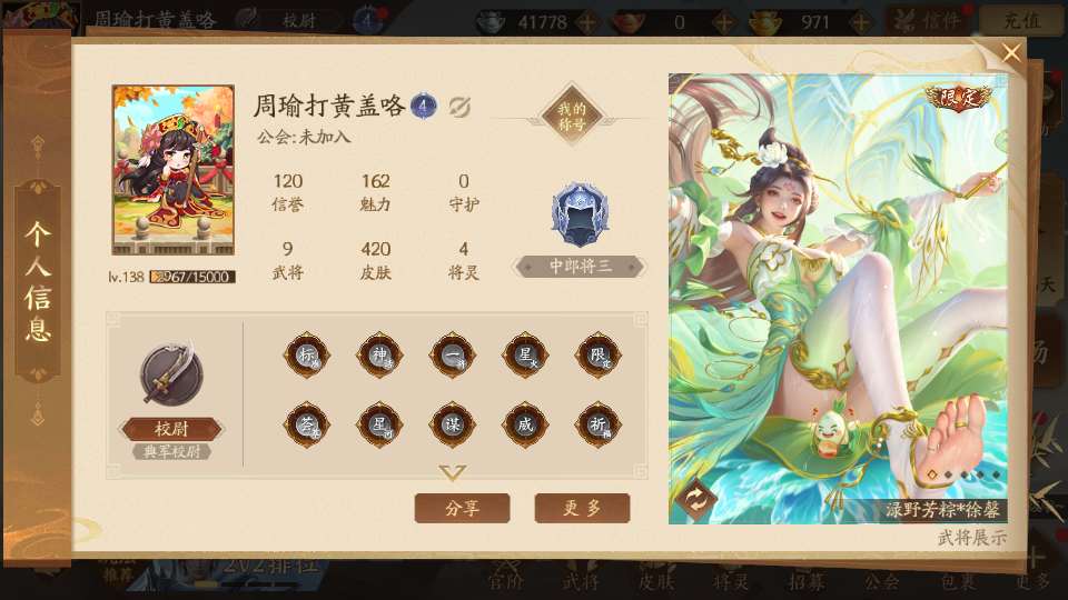 商品编号Dsa176 编号Dsa176 武将:谋姜维,谋邓艾 包裹:传世玉1,祈福灯62,V4会员,总武将9,总皮肤431,总国战3,帅点1.3w