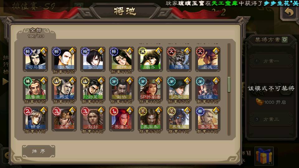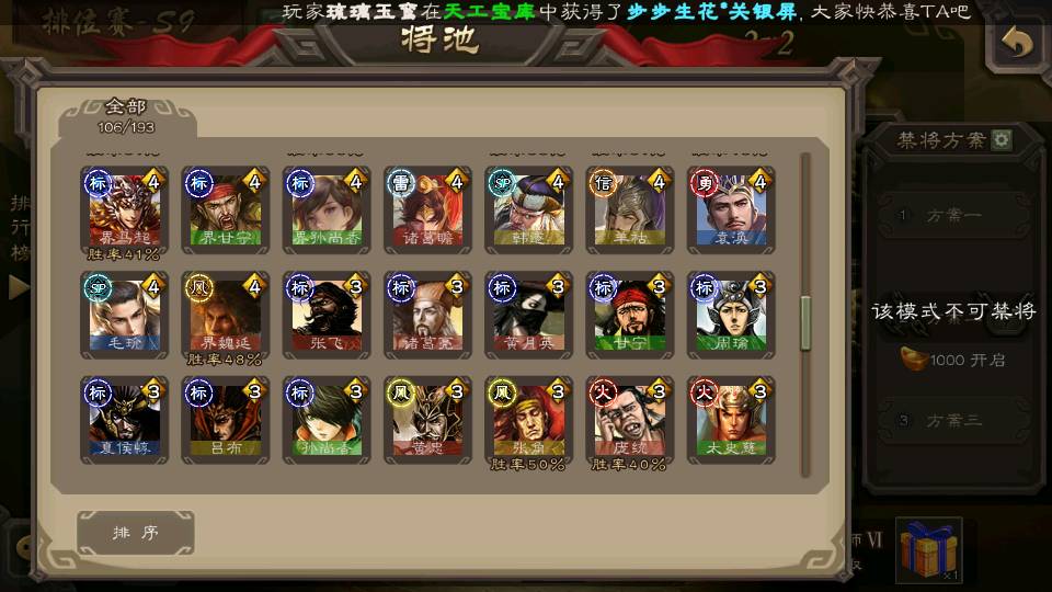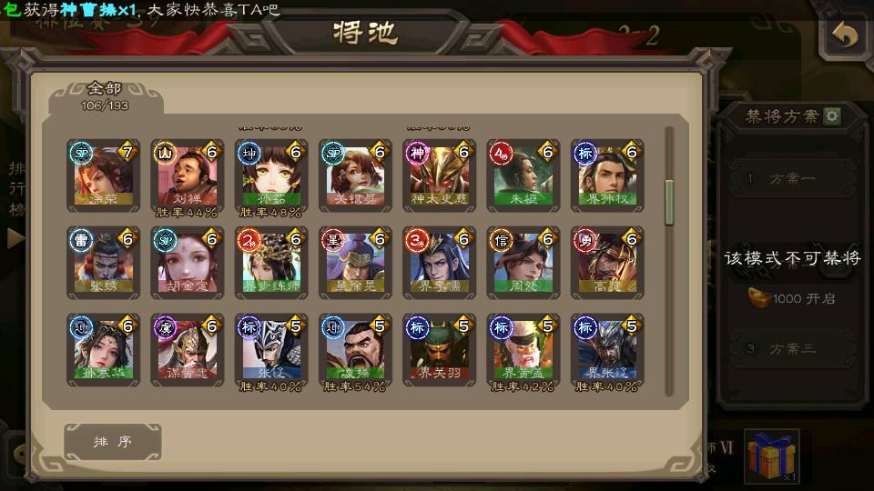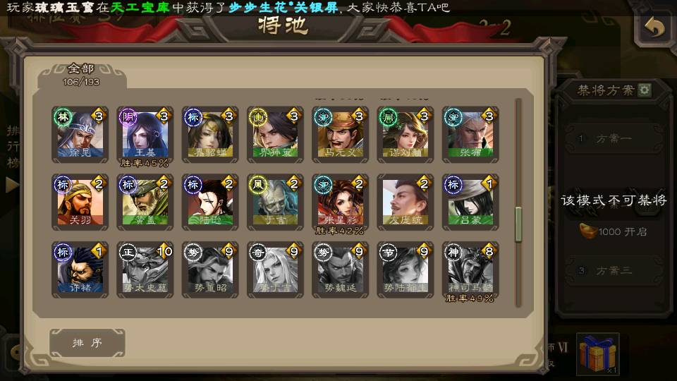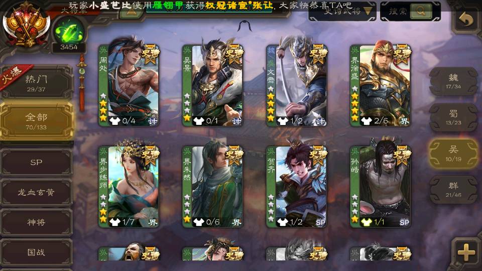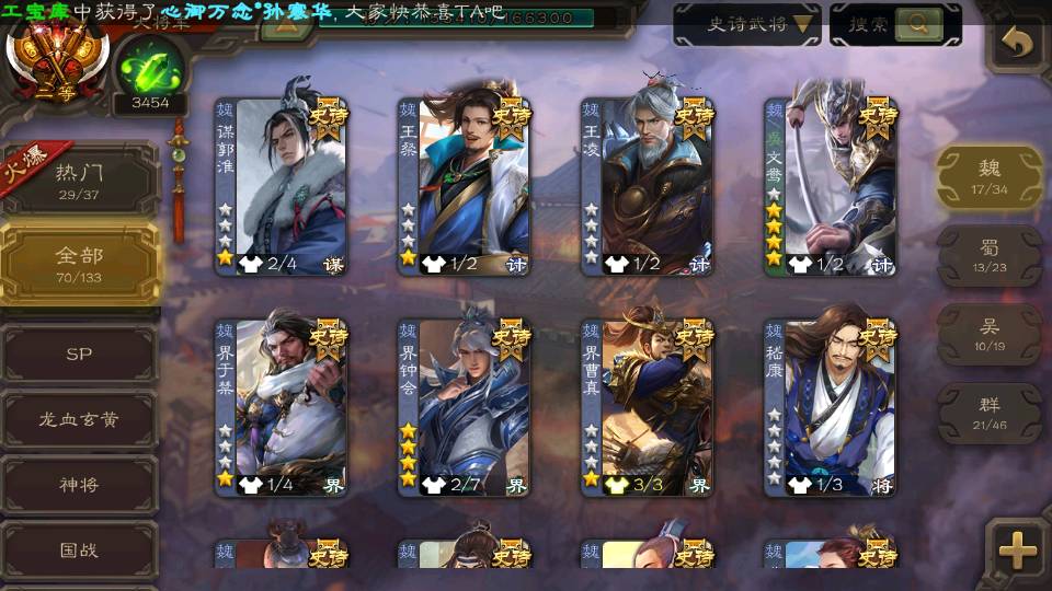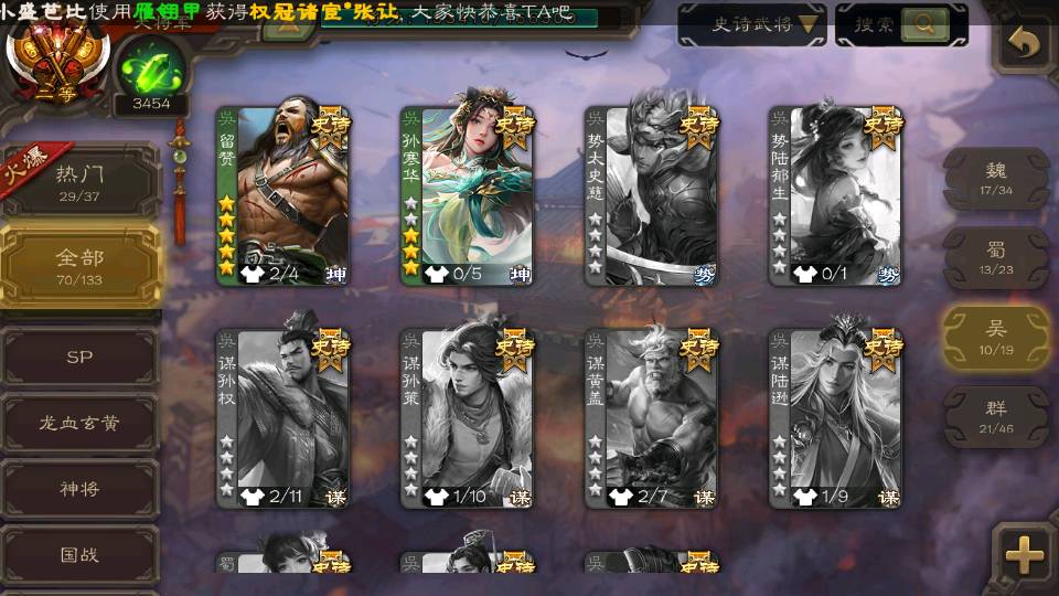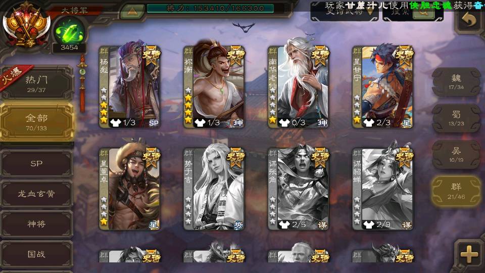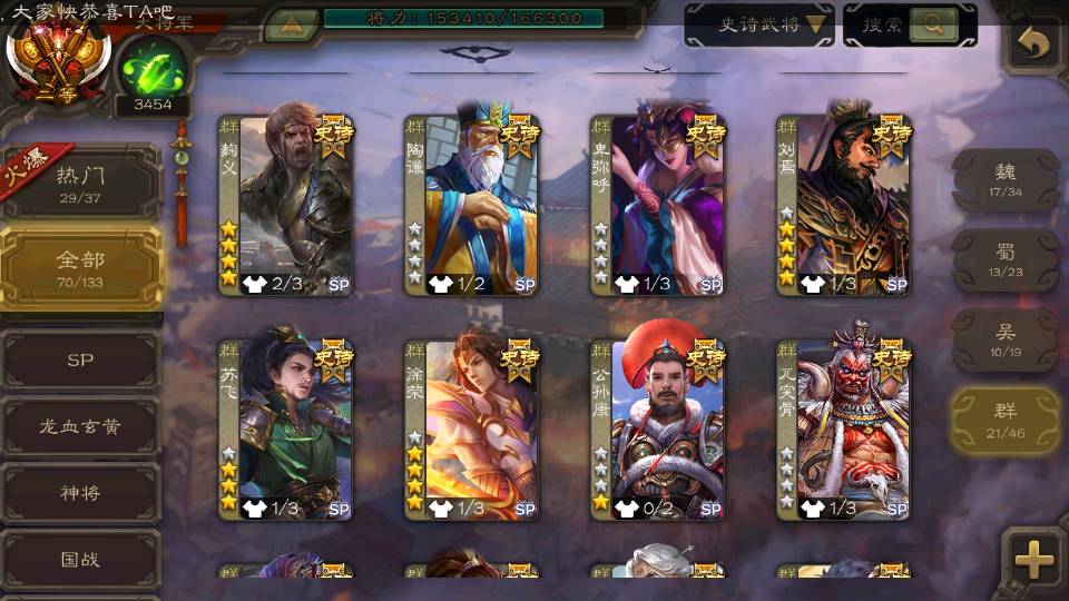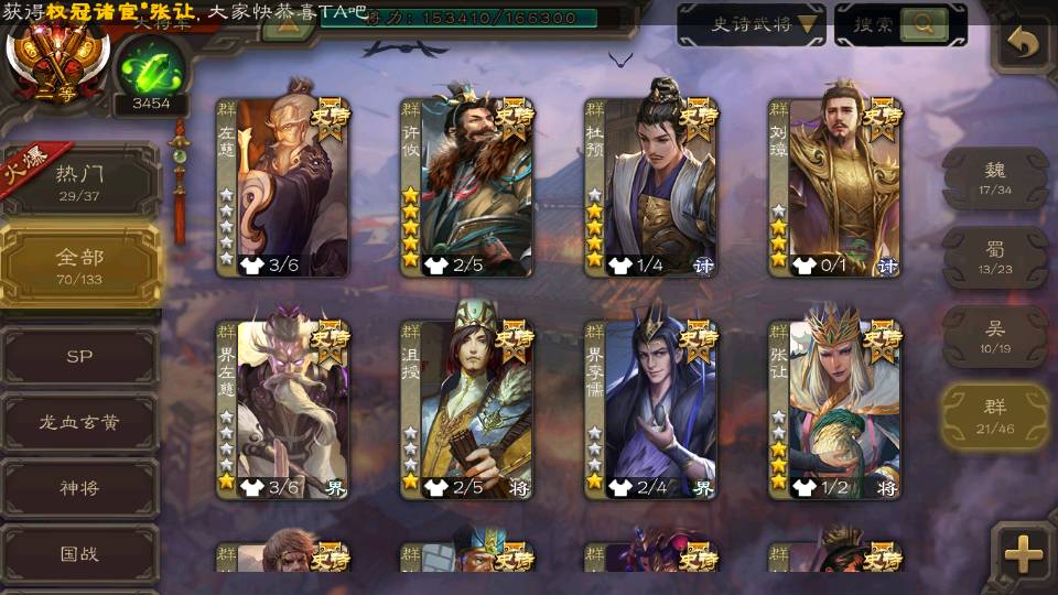(群雄):刘焉,徐荣,杨彪,杜预,祢衡,界左慈,南华老仙,麴义,许攸,张让,界李儒,苏飞,星董卓,星甘宁,卑弥呼,公孙康,刘璋,陶谦,左慈,沮授,兀突骨