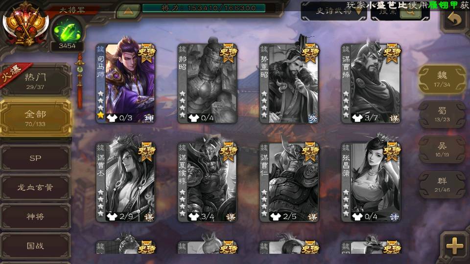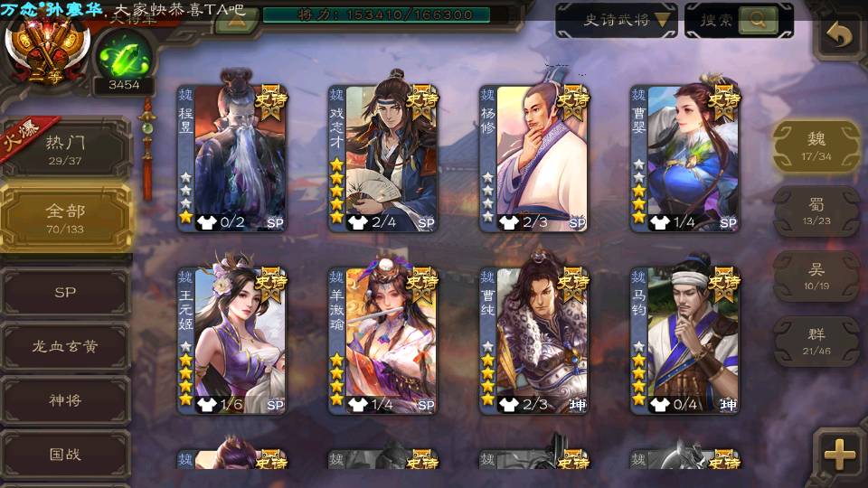 (魏国):曹婴,马钧,王元姬,羊徽瑜,文鸯,戏志才,界钟会,司马师,界于禁,王粲,界曹真,王凌,谋郭淮,程昱,曹纯,杨修,嵇康